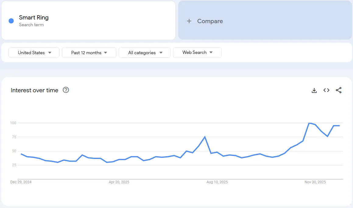 ऊपर दिए गए चार्ट को देखें. यह पिछले 90 दिनों में "सैमसंग रिंग" की खोज मात्रा है। क्या आप नवंबर में बड़े पैमाने पर उछाल देख रहे हैं? यानी सैमसंग शिक्षित करने के लिए लाखों डॉलर खर्च कर रहा है आपका भावी ग्राहक. अंतर्दृष्टि: जनता अब जानती है कि स्मार्ट रिंग क्या है। लेकिन अधिकांश उपभोक्ता $399 का भुगतान करने को तैयार नहीं हैं। खोज प्रवृत्ति स्थिर हो रही है, जिसका अर्थ है कि "प्रचार चरण" समाप्त हो गया है और किफायती विकल्पों ($50-$80) के लिए "खरीदारी चरण" शुरू हो रहा है।